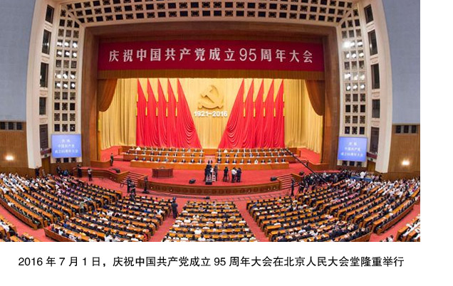 人民大会堂雄伟庄严,万人大礼堂灯火辉煌。主席台上方悬挂着“庆祝中国共产党成立95周年大会”会标。帷幕正中,由镰刀和锤头组成的中国共产党党徽在十面红旗映衬下熠熠生辉,“1921—2016”字样格外醒目。大礼堂二层眺台悬挂横幅:紧密团结在以习近平同志为总书记的党中央周围,锐意进取、开拓创新,全面推进党的建设新的伟大工程,为实现“两个一百年”奋斗目标、实现中华民族伟大复兴的中国梦而努力奋斗!