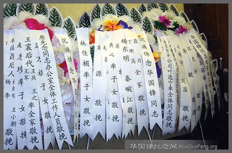 2008年8月31日上午,华国锋同志遗体告别仪式上各界人士送来花圈、挽联表示哀悼。