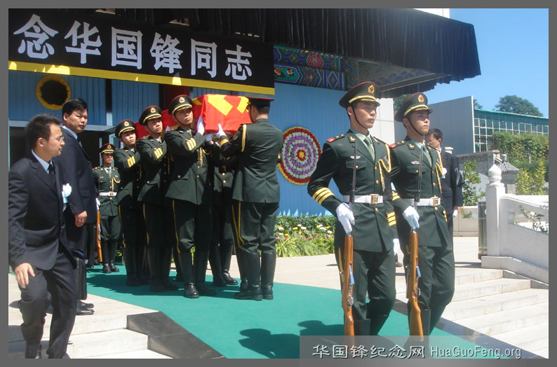 2008年8月31日上午,华国锋同志遗体告别仪式结束后,灵柩在解放军仪仗兵护送下移出八宝山革命公墓东告别厅。