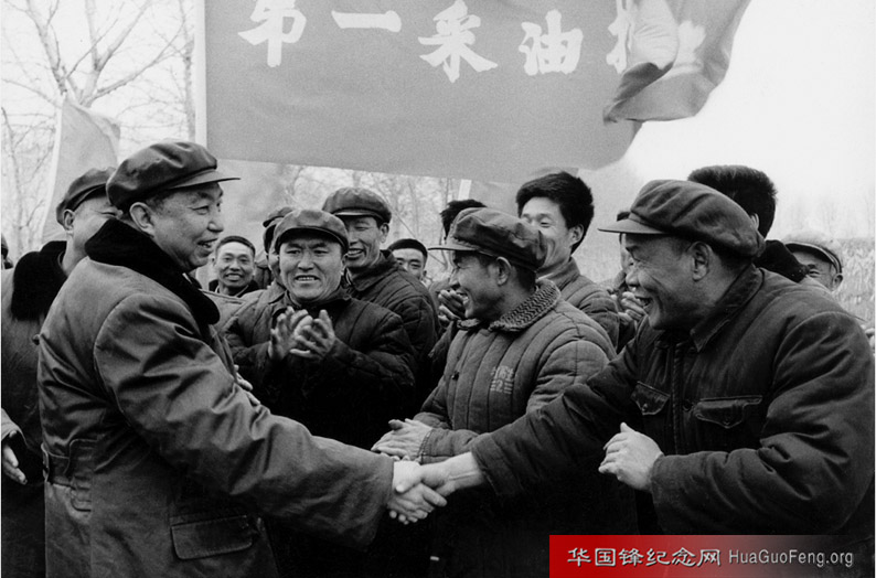 1977年4月19日,华国锋来到大庆油田机械设备检查汇报现场时,受到参加操作表演的工人的热烈欢迎。
