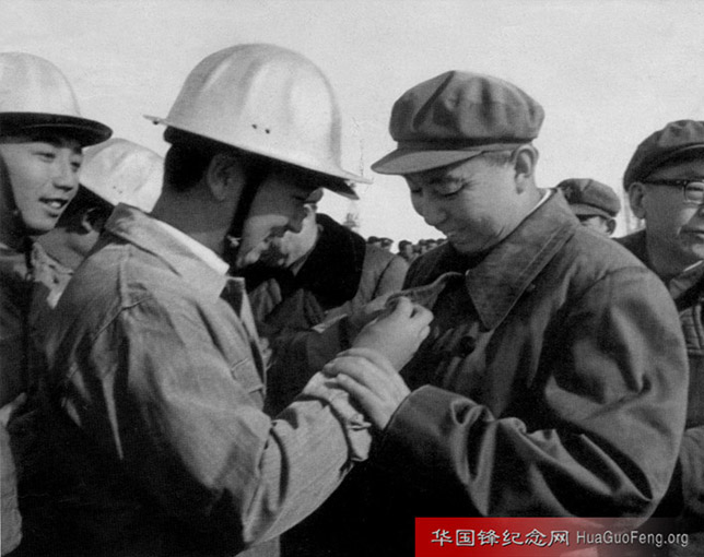 1977年4月19日,王进喜的小儿子、一二○五钻井队二班副钻王月甫把大庆纪念章给华主席戴在胸前。